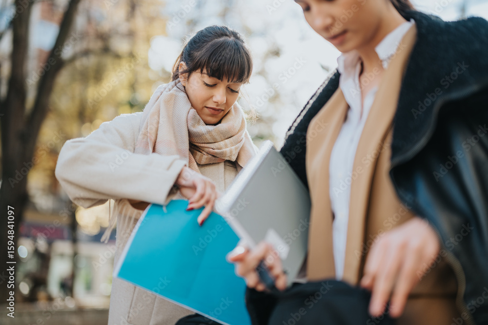 Two women wearing business attire are handling paperwork during autumn in an outdoor city environment, portraying teamwork and professional commitment.