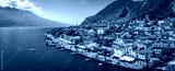 Aerial view of Limone sul Garda, a colorful lakeside town in Italy nestled between Lake Garda and steep mountains under a bright blue sky