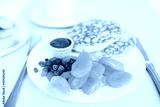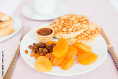 pancakes with jam, raisins and dried apricots on a white plate