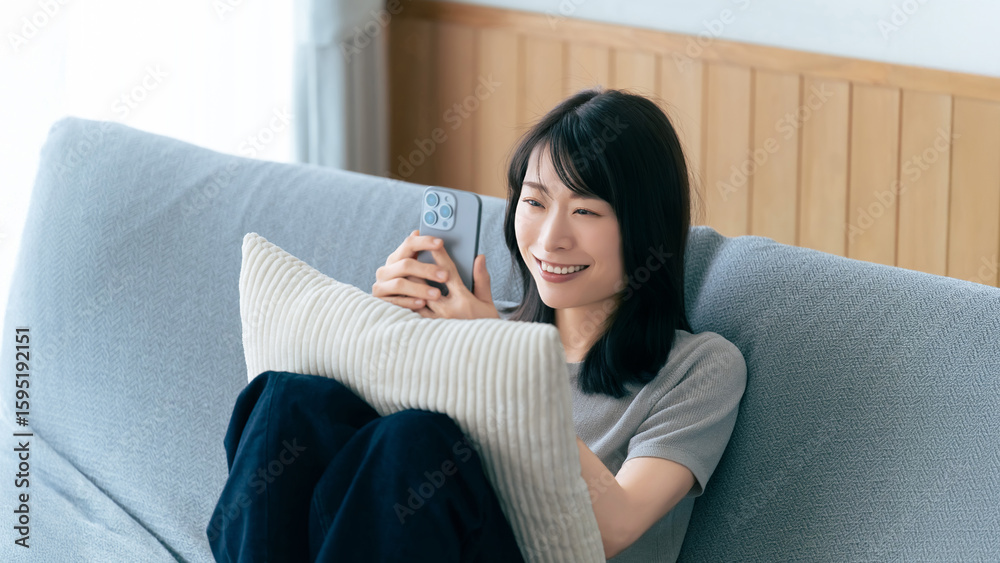 ソファに座ってスマートフォンを使う笑顔の女性