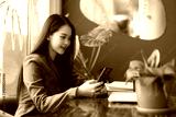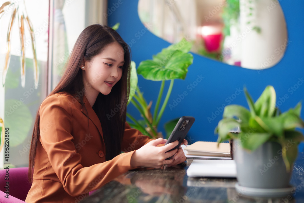 Asian adult woman uses smartphone for business communication and professional networking at a contemporary cafe