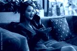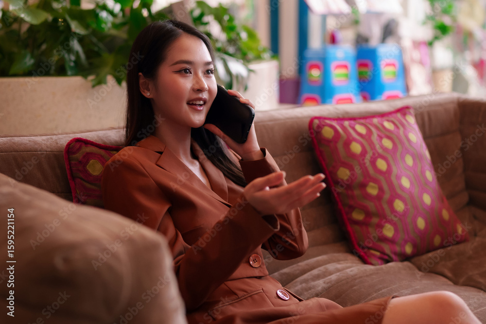 Asian adult businesswoman talking on smartphone in modern lounge confident professional communication corporate environment