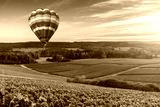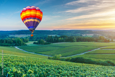 Colorful hot air balloons flying over champagne Vineyards at sunset montagne de Reims, France