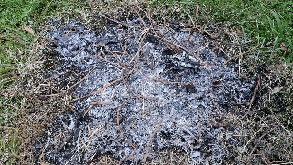 Burnt Grass and Ashes on Forest Floor, Wildfire Aftermath Scene, Environmental Disaster Due to Careless Burning