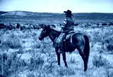 Cowboy wrangler watching over horse herd as they rest and graze during long trail drive