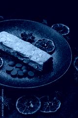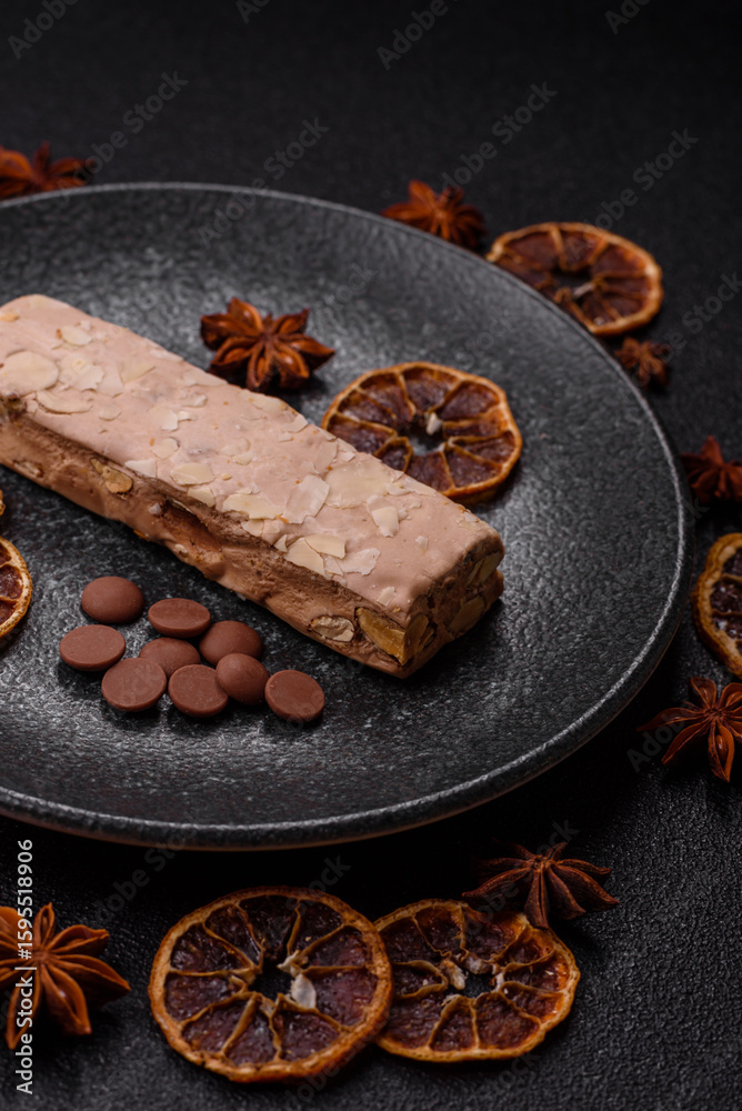 Nougat or white caramel with hazelnuts and pistachios and citrus pieces. White nougat with nuts