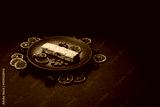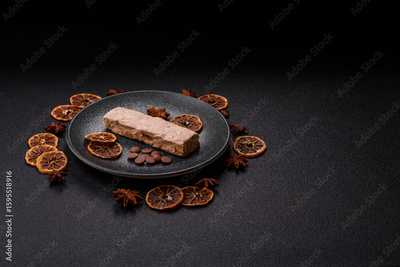 Nougat or white caramel with hazelnuts and pistachios and citrus pieces. White nougat with nuts