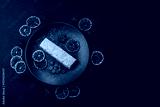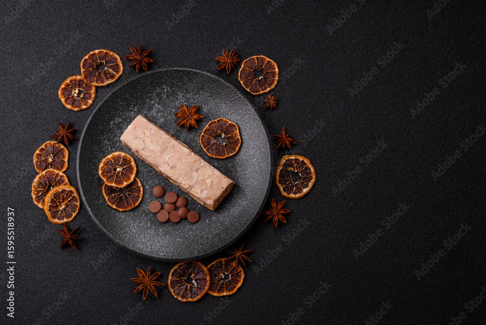 Nougat or white caramel with hazelnuts and pistachios and citrus pieces. White nougat with nuts