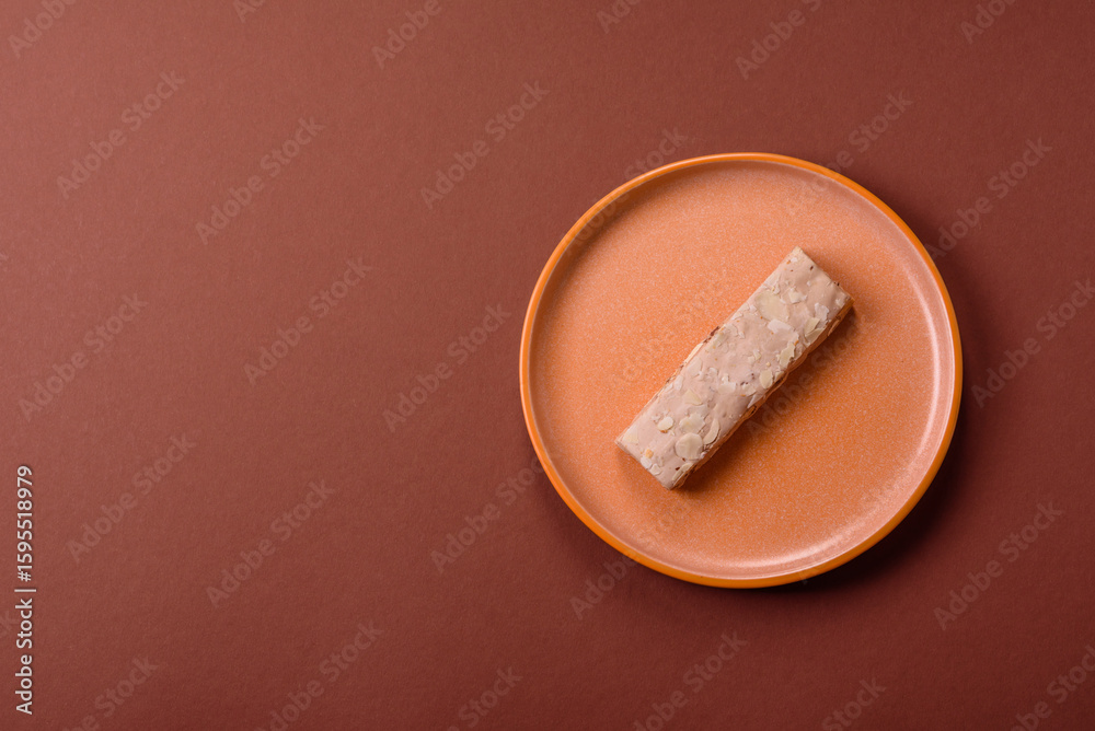 Nougat or white caramel with hazelnuts and pistachios and citrus pieces. White nougat with nuts