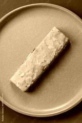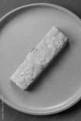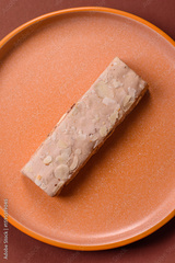 Nougat or white caramel with hazelnuts and pistachios and citrus pieces. White nougat with nuts
