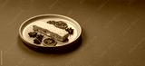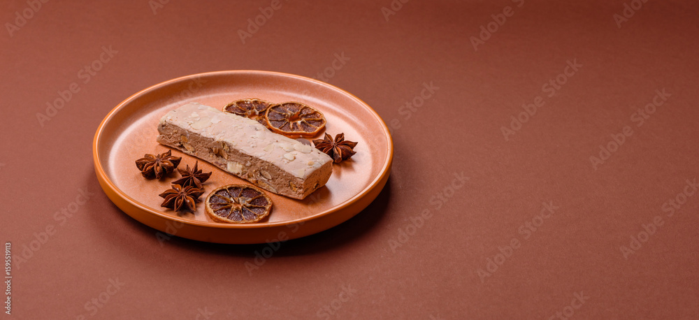 Nougat or white caramel with hazelnuts and pistachios and citrus pieces. White nougat with nuts