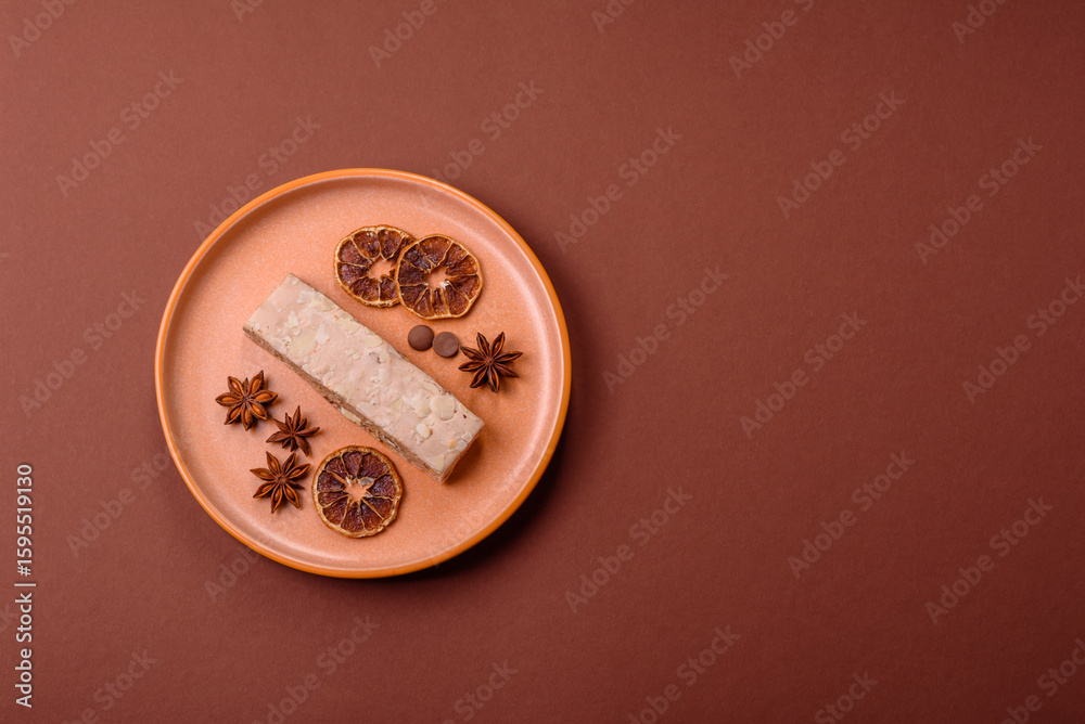 Nougat or white caramel with hazelnuts and pistachios and citrus pieces. White nougat with nuts