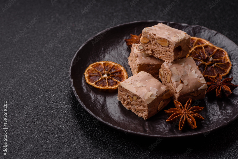 Nougat or white caramel with hazelnuts and pistachios and citrus pieces. White nougat with nuts