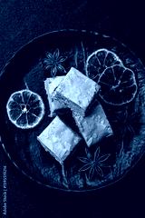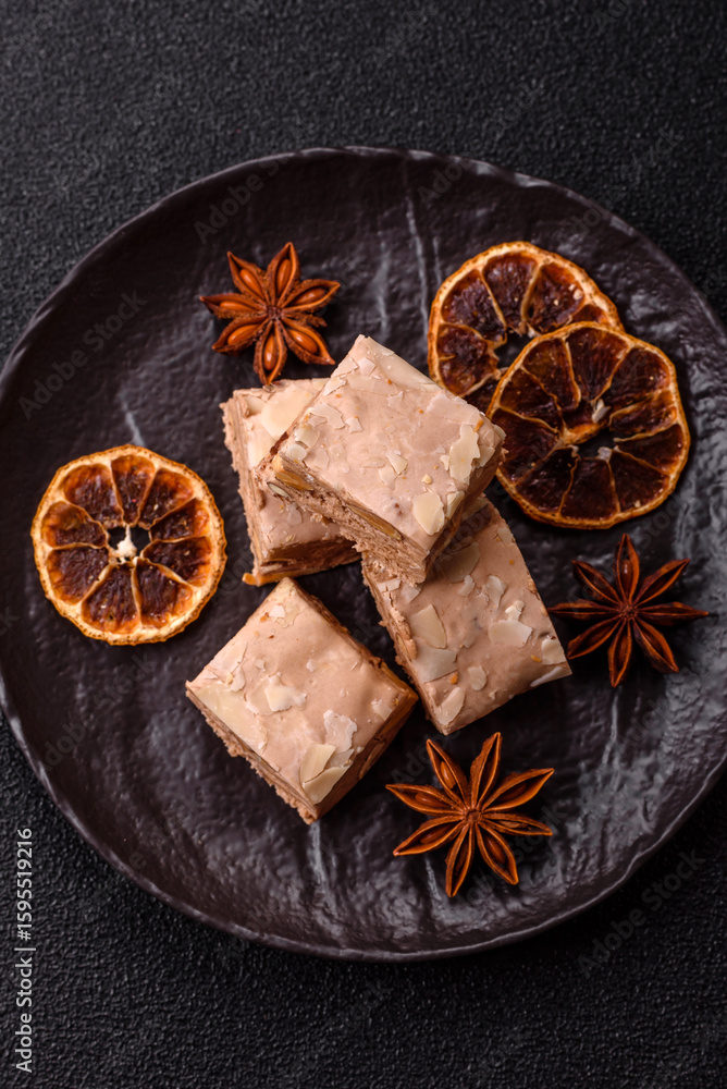 Nougat or white caramel with hazelnuts and pistachios and citrus pieces. White nougat with nuts
