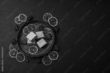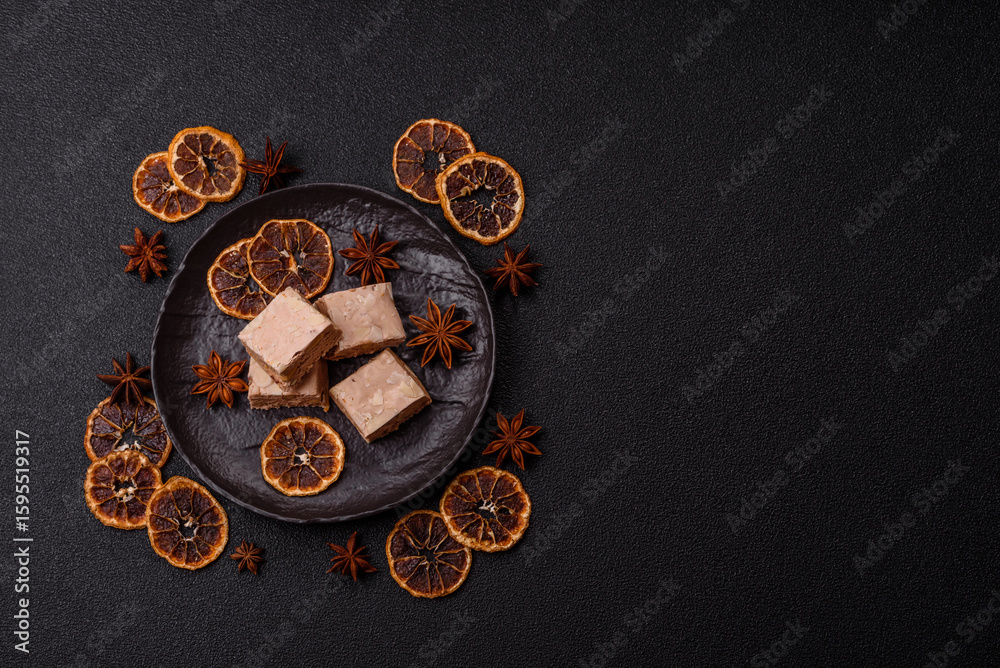 Nougat or white caramel with hazelnuts and pistachios and citrus pieces. White nougat with nuts