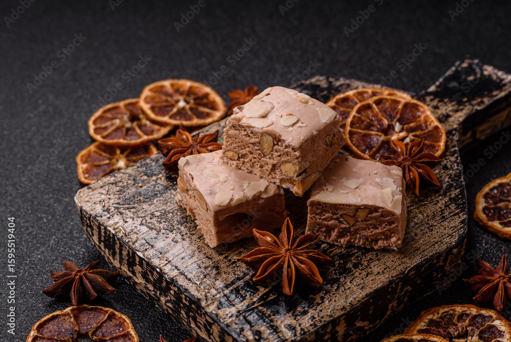 Nougat or white caramel with hazelnuts and pistachios and citrus pieces. White nougat with nuts