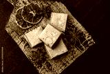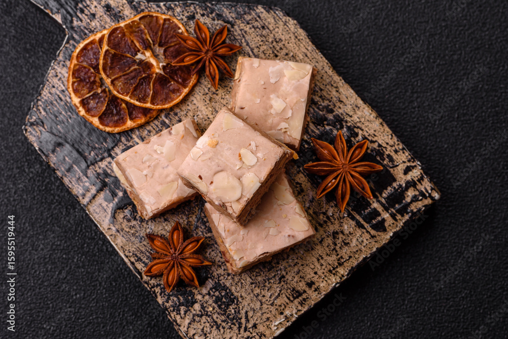 Nougat or white caramel with hazelnuts and pistachios and citrus pieces. White nougat with nuts