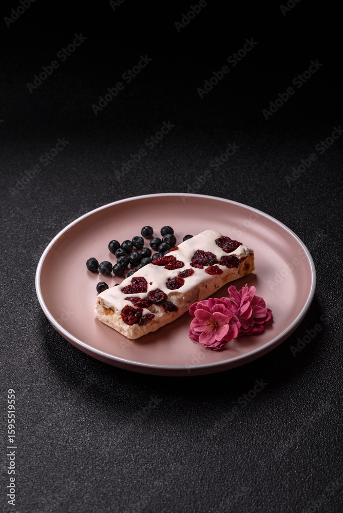Nougat or white caramel with hazelnuts and pistachios and citrus pieces. White nougat with nuts
