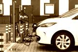 Electric car on charge. Ecological mode of transport. Environmental protection. Green energy.