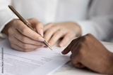 Close up of womans hands on paper document, bank advisor pointing to area to sign, client holds pen places signature, finalizing partnership agreement, signing contract, authorizing service agreement