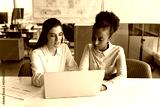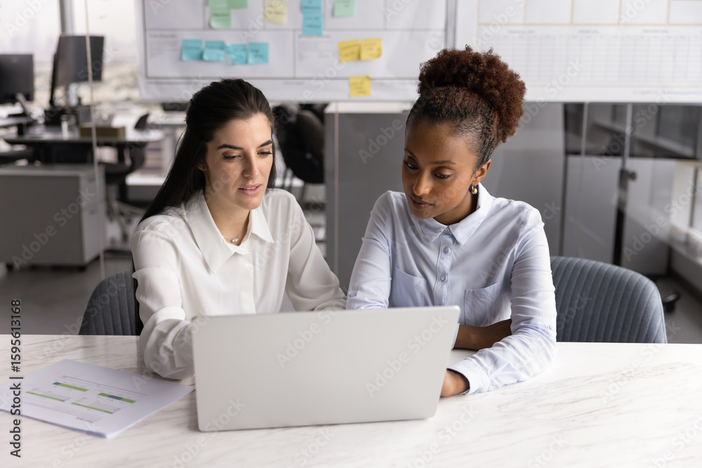 Two multiracial women colleagues sit at desk in office using laptop, discussing new task or software, review client proposals, preparing for upcoming meeting, share solutions, making decision together