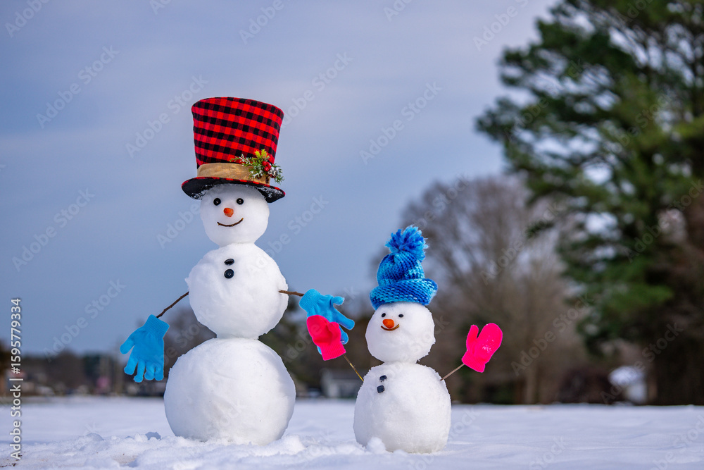 Funny snowman in snowy landscape. Snowman in winter holiday. Decorated snowman. Greeting card for New Year and Christmas poster. Family snowmen with snow background. Xmas winter banner.