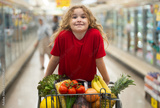 Child with shopping basket in vegetable section. Kid picking fruits at grocery store. Child with shopping cart. Kid shopping in supermarket. Kid shopping healthy produce. Kid in grocery shop.