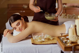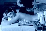Young woman is put on a mask on her back in spa salon.