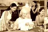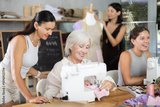 In creative course for adults, enthusiastic mature woman working at sewing machine while other participant friendly chatting, collaborating, fitting garment and preparing fabric..