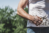 Attractive worker, pliers and dirty t-shirt. Labor day. Front view, close up. Outdoor. Labor and employment concept