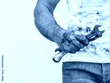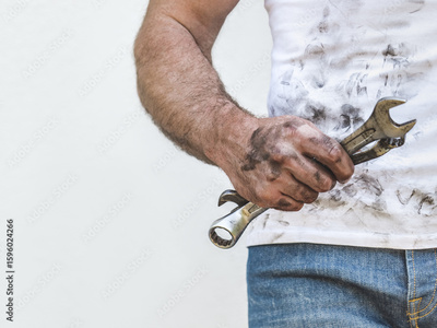 Handsome worker, hand tools and dirty t-shirt. Labor day. Front view, close up, studio shot. Labor and employment concept