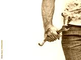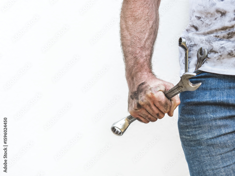Handsome worker, hand tools and dirty t-shirt. Labor day. Front view, close up, studio shot. Labor and employment concept