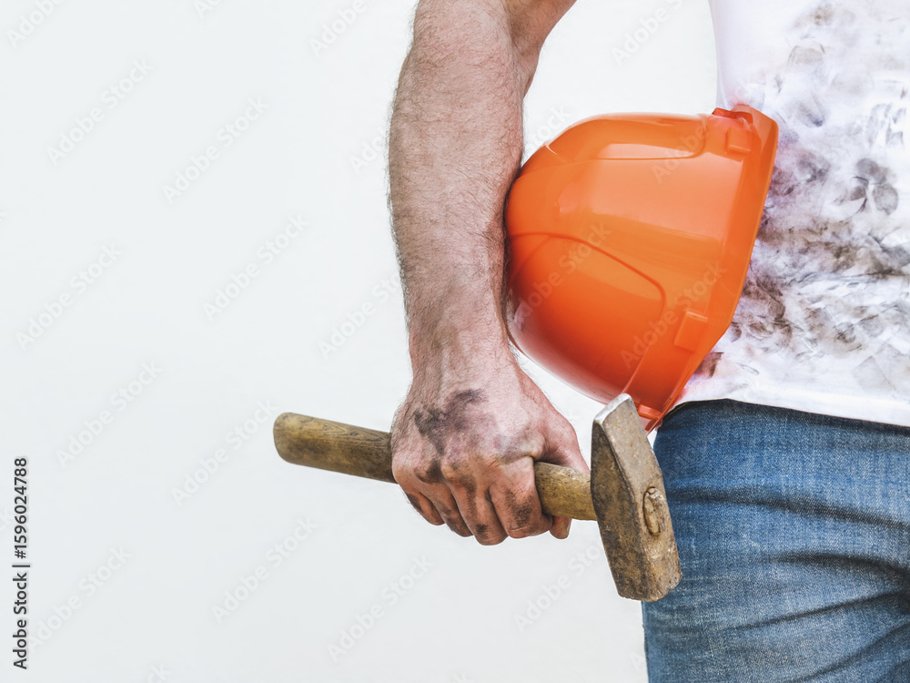 Attractive man in work clothes and hardhat. Labor day. Close-up, indoors. Studio shot. Front view, close up. Labor and employment concept