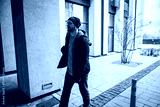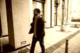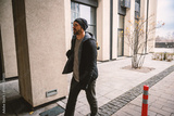 A man in a black beanie and jacket walks purposefully through a modern urban environment on a cool day, exuding a sense of contemporary lifestyle and quiet determination.