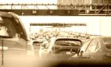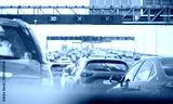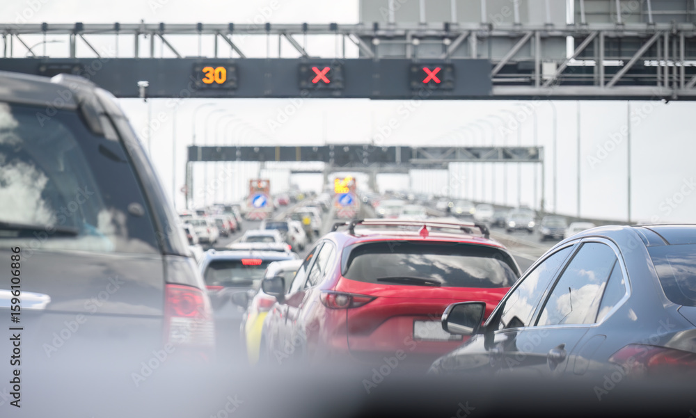 Auckland harbour bridge lane closure and traffic jam due to strong wind. Auckland. New Zealand.