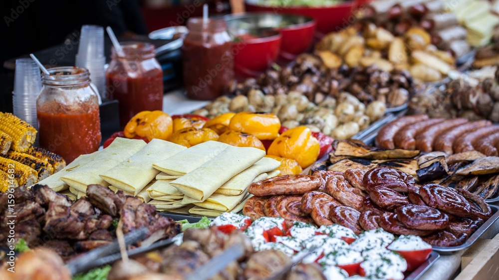 Food at the festival of street food, sausages, hot dog, fried potatoes, shish kebab, fried meat, fried corn and various drinks