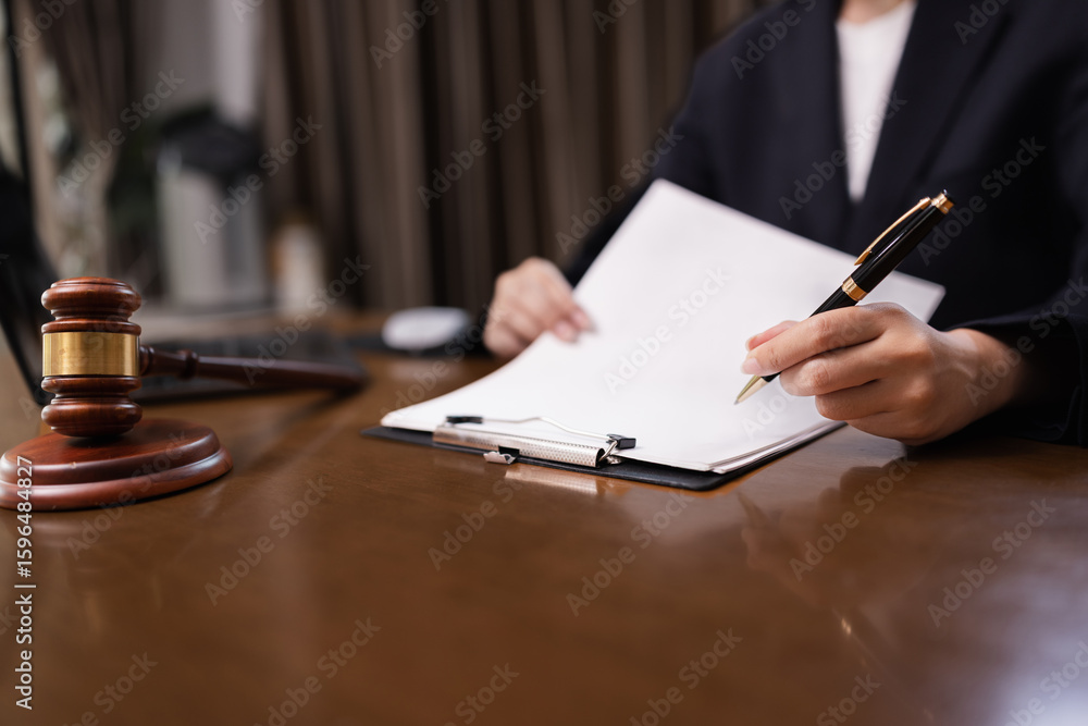 Lawyer Businesswoman Working with Documents and Signing Contract at Office Desk, Hammer on Wood table, Judge's Gavel, Law, Justice Symbol,