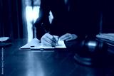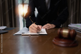 Lawyer Businesswoman Working with Documents and Signing Contract at Office Desk, Hammer on Wood table, Judge's Gavel, Law, Justice Symbol,