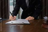 Lawyer Businesswoman Working with Documents and Signing Contract at Office Desk, Hammer on Wood table, Judge's Gavel, Law, Justice Symbol,
