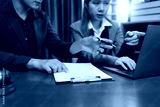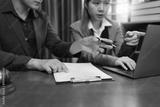 Emotional Mental Support, Lawyer woman and Man with Document Paper and Hammer on Wood table, Agreement and Partnership Concept,