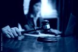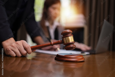 Lawyer Holding Hammer with Document Paper on Wood table, Law, Justice Symbol,
