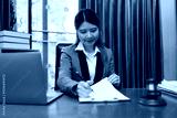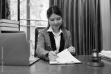 Law Woman Working with Document Paper and Hammer on Wood table, Judge's Gavel, law, Justice Symbol,