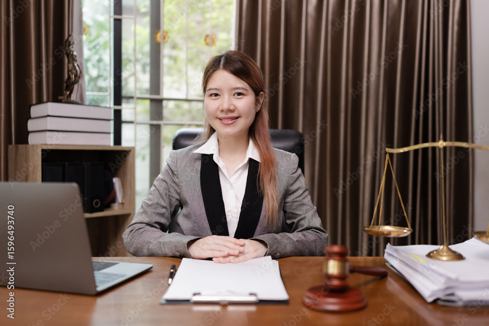 Lawyer Female Look at Camera with Hammer with Document Paper Sitting at The Table, Law, Justice Symbol,