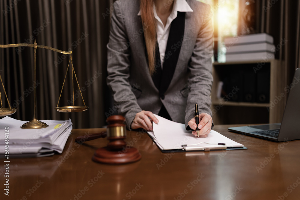 Female Lawyer Working on Document Paper with Writing Signature and Lawyer Hammer at Office Desk, Judge's Gavel, Law,