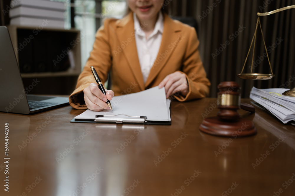 Female Lawyer Working on Document Paper with Writing Signature and Lawyer Hammer at Office Desk, Judge's Gavel, Law,