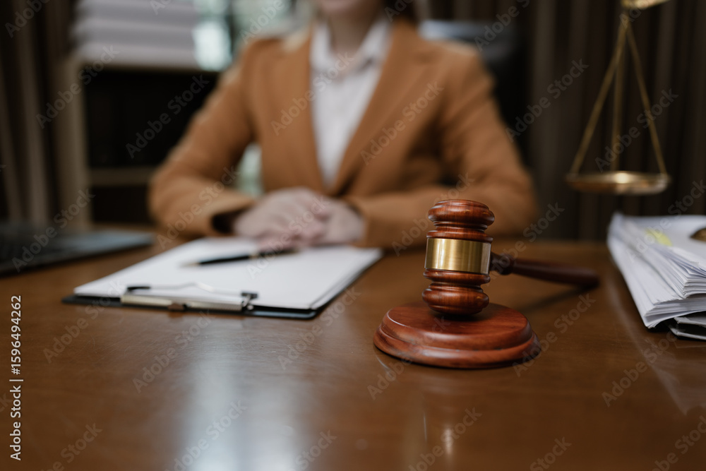 Lawyer Holding Hammer with Document Paper on Wood table, Law, Justice Symbol,