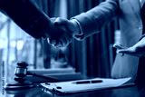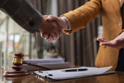 Lawyer Handshake in Business Meeting, Agreement and Partnership, Hammer of Justice,