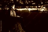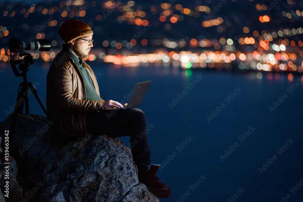 Young attractive photographer sitting on rock and working on laptop with view of sea and mountains