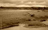 Wetland area with calm river bend and grassy shoreline under cloudy sky in natural reserve zone captured for environmental protection design and peaceful nature background