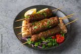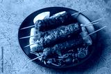 Fried lula kebab on skewers served with fresh vegetables - Greek kebab or meatballs on skewers